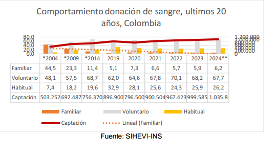A lo largo de las últimas dos décadas y del trabajo constante por parte de la Red Nacional de Bancos de Sangre liderada técnicamente por el Instituto Nacional de Salud, se ha incrementado la donación voluntaria de sangre en Colombia. En 2004, la donación voluntaria representaba el 55,5%, una donación que se basaba en la motivación de los familiares de los pacientes, y que por tanto equivalía a 44,5% del total de donantes que acudían a la donación de sangre porque su familiar requería de ello para su tratamiento médico.